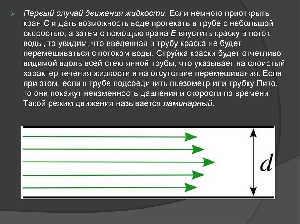 Первый случай движения жидкости. Если немного приоткрытькран С и дать возможность воде протекать в трубе с небольшой