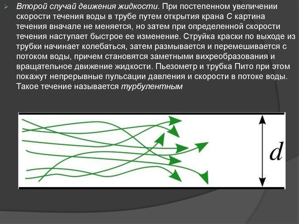 Второй случай движения жидкости. При постепенном увеличениискорости течения воды в трубе путем открытия крана С картина