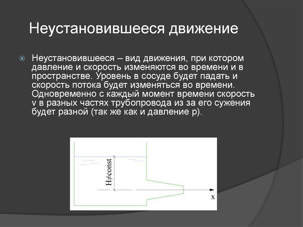 Неустановившееся – вид движения, при которомдавление и скорость изменяются во времени и в