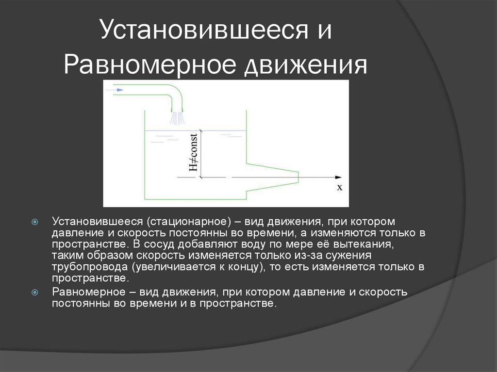 Установившееся (стационарное) – вид движения, при которомдавление и скорость постоянны во времени, а изменяются только в