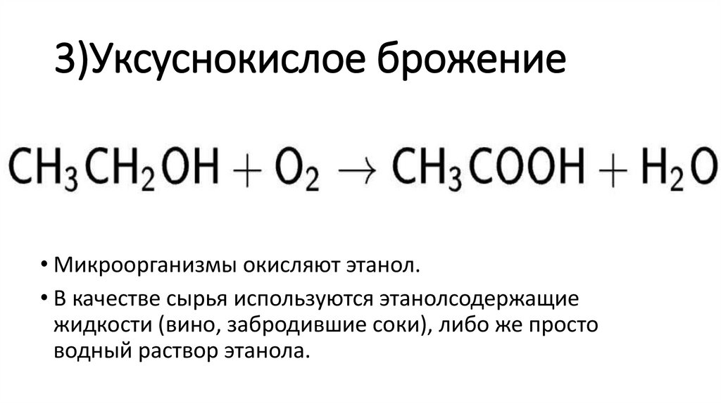 3)Уксуснокислое брожение• Микроорганизмы окисляют этанол.