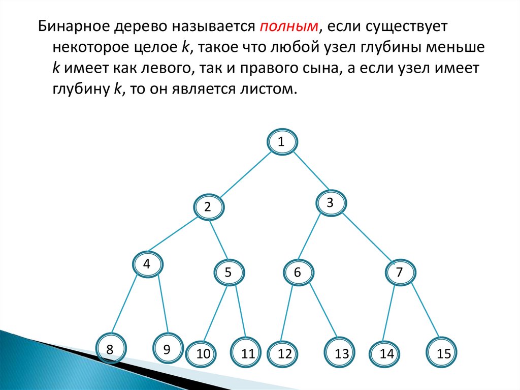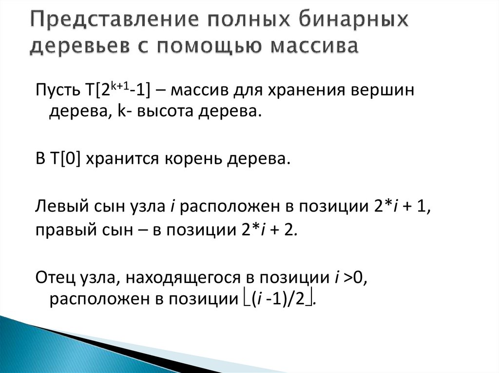 Пусть T[2k+1-1] – массив для хранения вершиндерева, k- высота дерева.