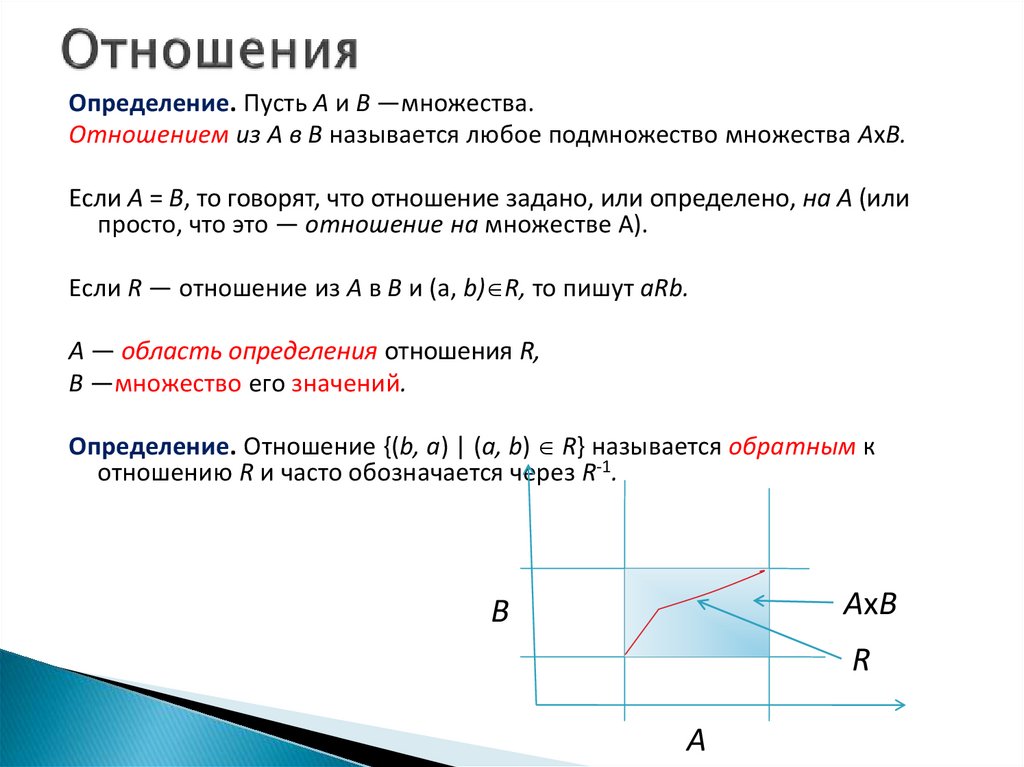 Если R — отношение из A в B и (а, b) R, то пишут аRb.