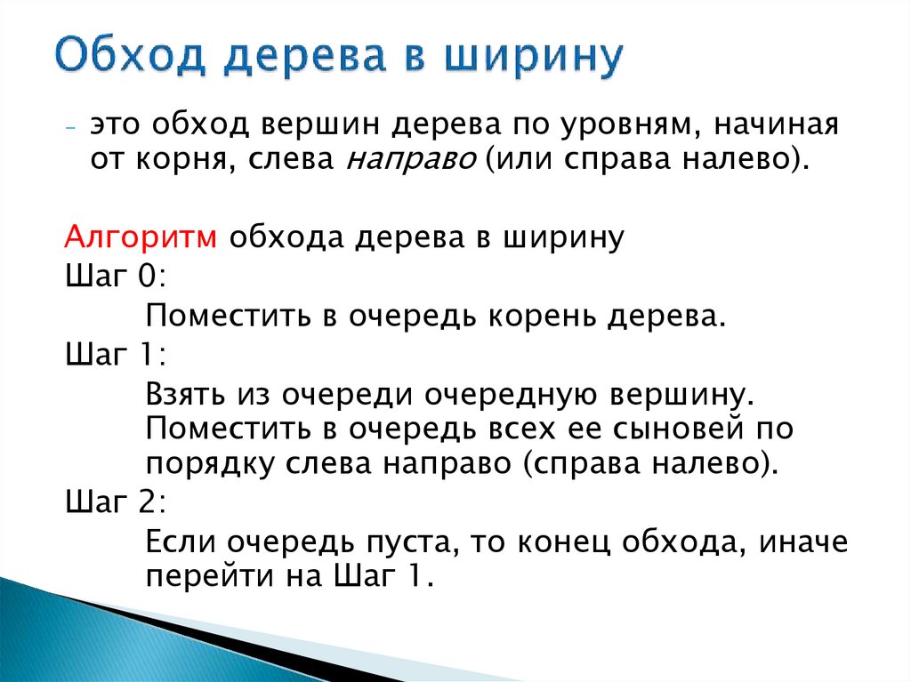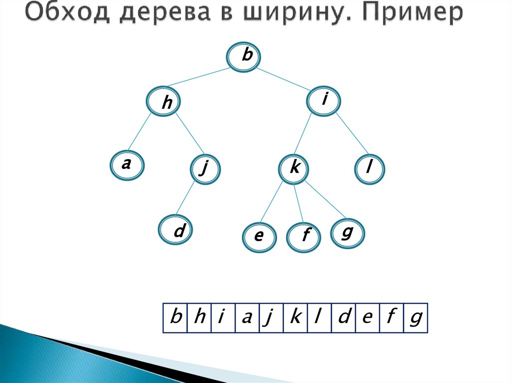 - это обход вершин дерева по уровням, начинаяот корня, слева направо (или справа налево).