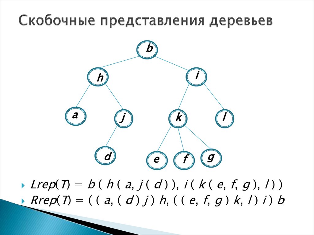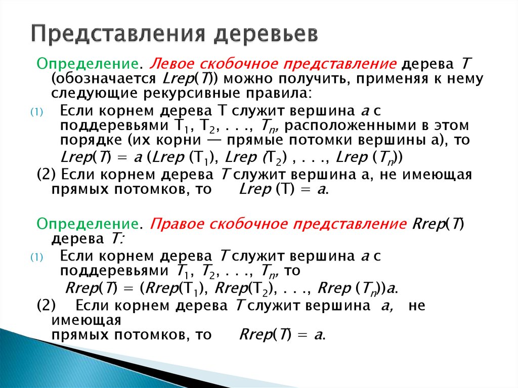 Определение. Левое скобочное представление дерева Т(обозначается Lrep(Т)) можно получить, применяя к нему