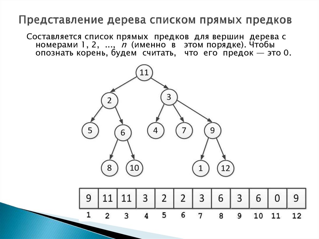 Составляется список прямых предков для вершин дерева cномерами 1, 2, ..., n (именно в этом порядке). Чтобы
