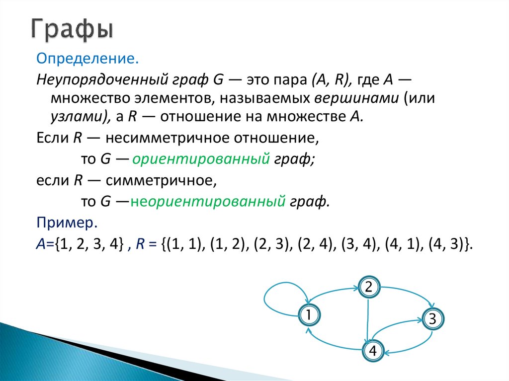 Определение.Неупорядоченный граф G — это пара (А, R), где А —