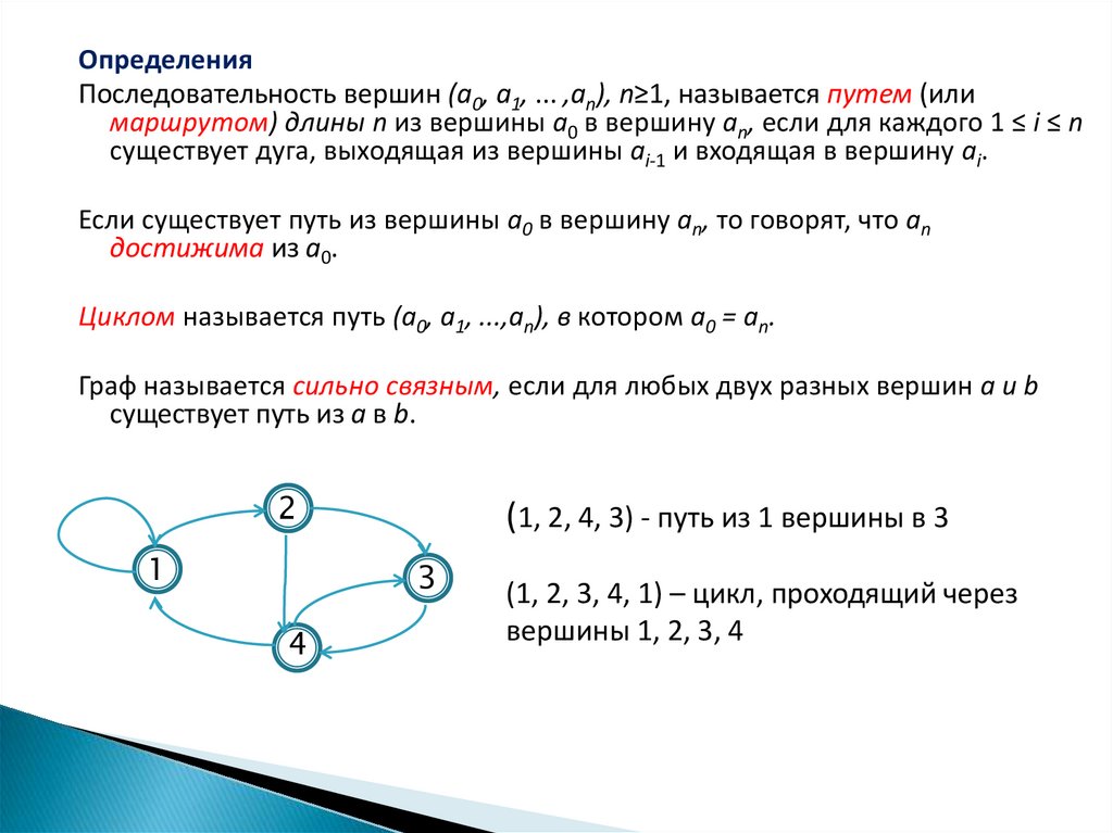 ОпределенияПоследовательность вершин (а0, а1, ... ,аn), n≥1, называется путем (или