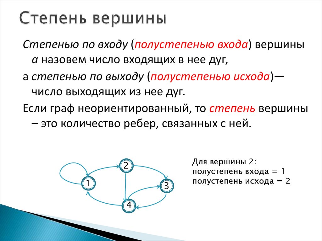 Степенью по входу (полустепенью входа) вершиныа назовем число входящих в нее дуг,