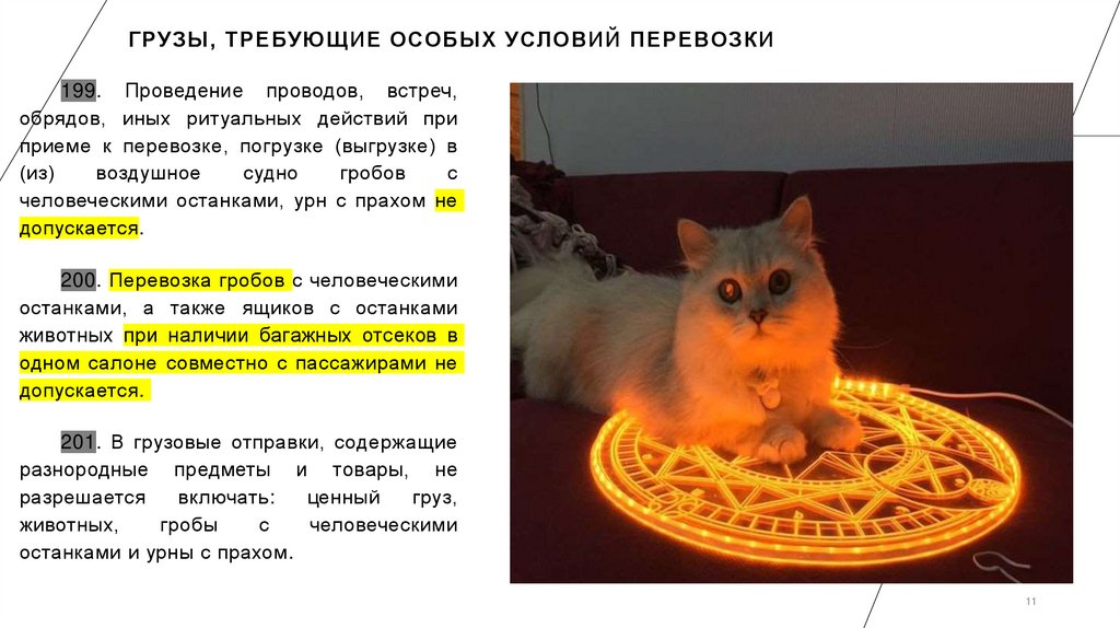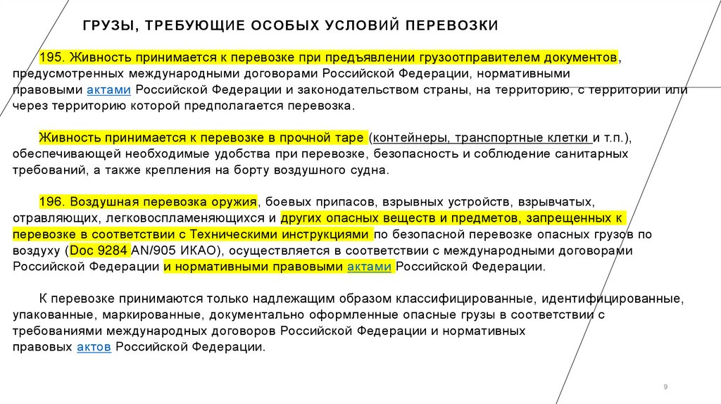 ГРУЗЫ, ТРЕБУЮЩИЕ ОСОБЫХ УСЛОВИЙ ПЕРЕВОЗКИ195. Живность принимается к перевозке при предъявлении грузоотправителем документов,