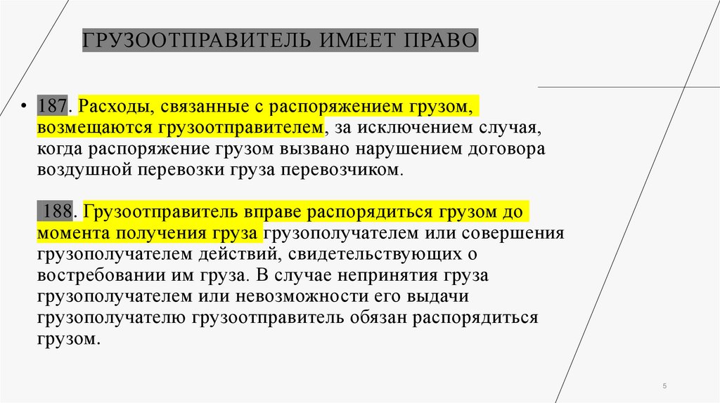 ГРУЗООТПРАВИТЕЛЬ ИМЕЕТ ПРАВО• 187. Расходы, связанные с распоряжением грузом,