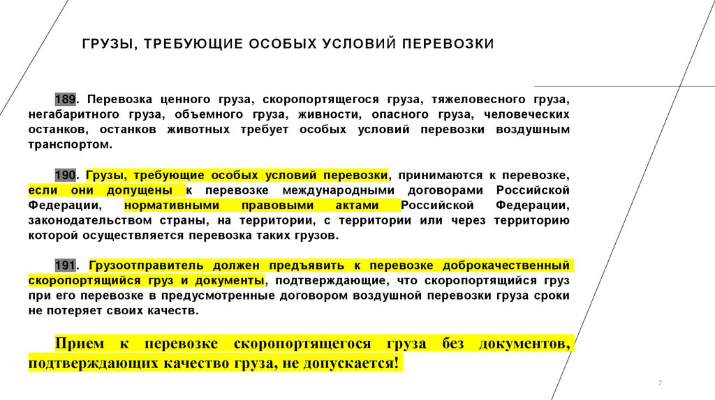 ГРУЗЫ, ТРЕБУЮЩИЕ ОСОБЫХ УСЛОВИЙ ПЕРЕВОЗКИ189. Перевозка ценного груза, скоропортящегося груза, тяжеловесного груза,