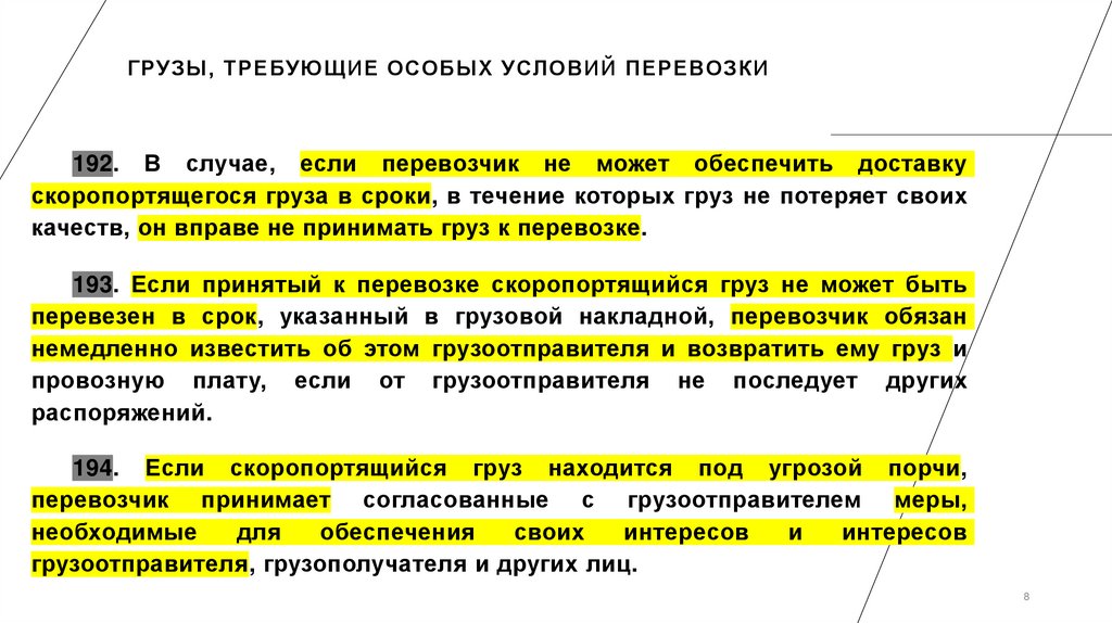 ГРУЗЫ, ТРЕБУЮЩИЕ ОСОБЫХ УСЛОВИЙ ПЕРЕВОЗКИ192. В случае, если перевозчик не может обеспечить доставку