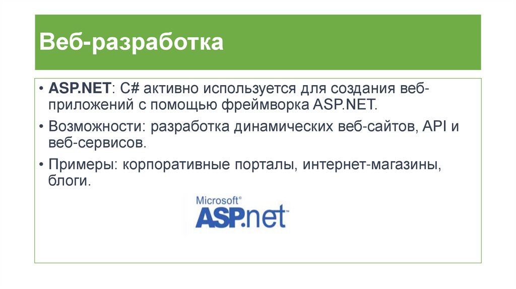 Веб-разработка• ASP.NET: C# активно используется для создания вебприложений с помощью фреймворка ASP.NET.