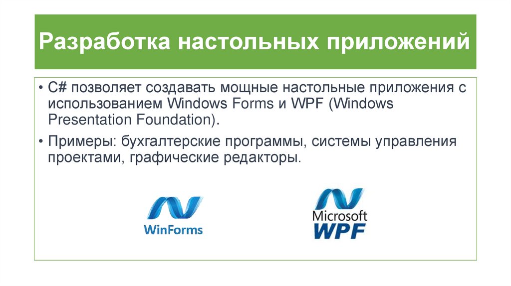 Разработка настольных приложений• C# позволяет создавать мощные настольные приложения с