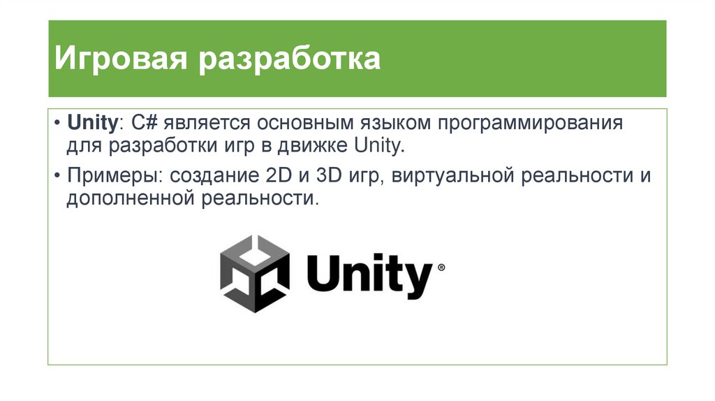 Игровая разработка• Unity: C# является основным языком программирования