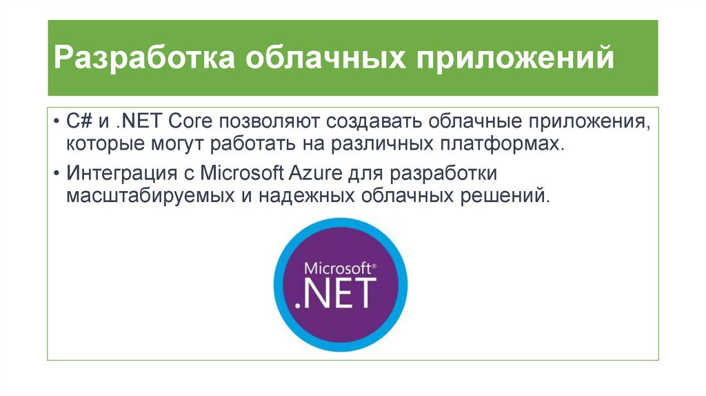 Разработка облачных приложений• C# и .NET Core позволяют создавать облачные приложения,