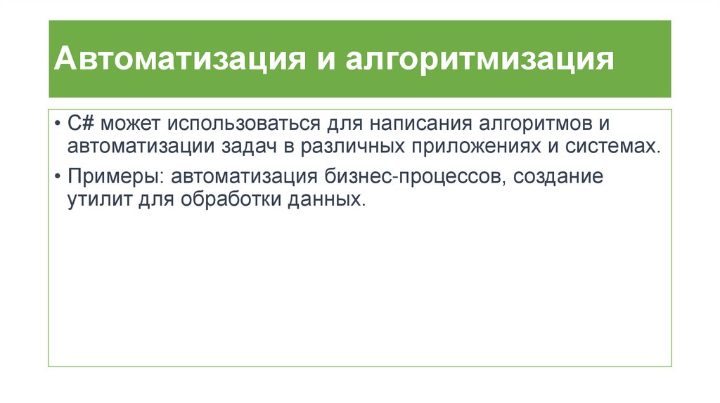 Автоматизация и алгоритмизация• C# может использоваться для написания алгоритмов и