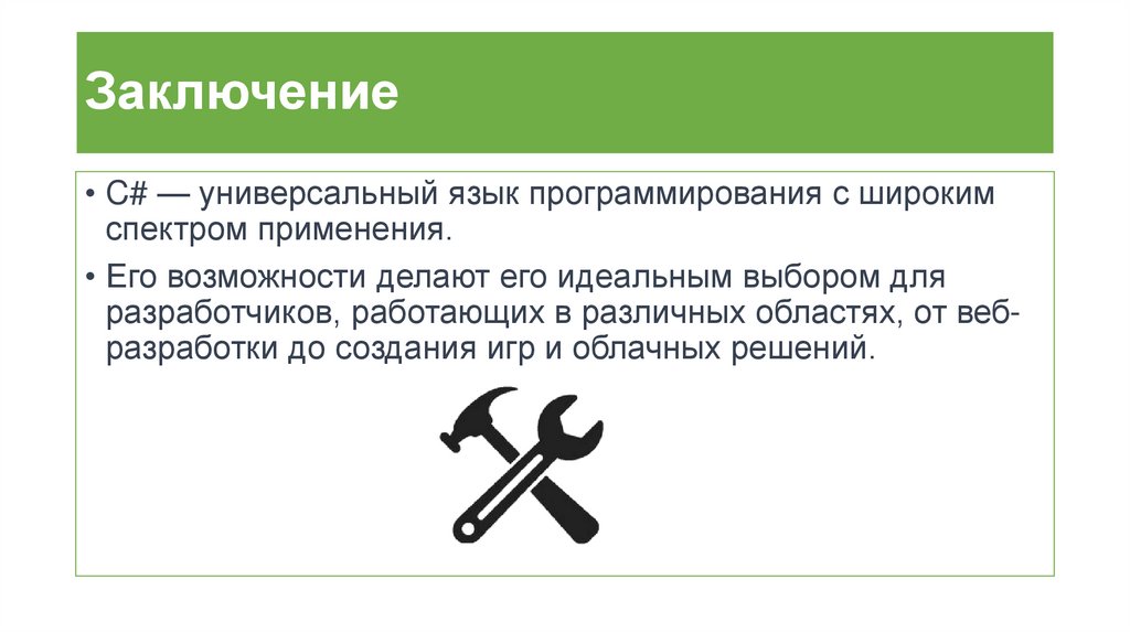 Заключение• C# — универсальный язык программирования с широким