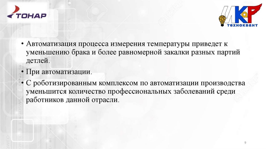 • Автоматизация процесса измерения температуры приведет куменьшению брака и более равномерной закалки разных партий