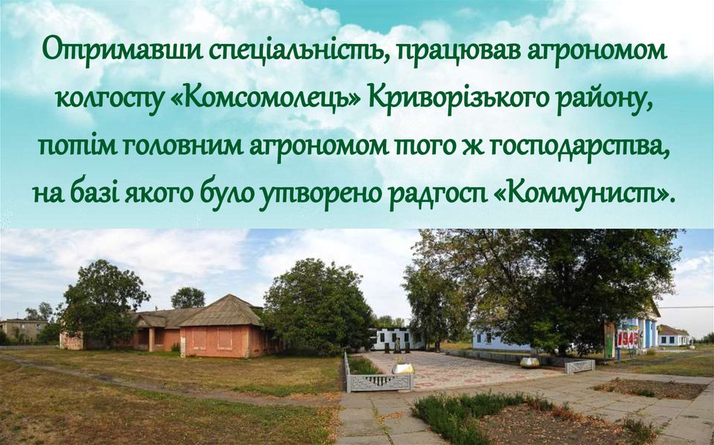 Отримавши спеціальність, працював агрономомколгоспу «Комсомолець» Криворізького району,