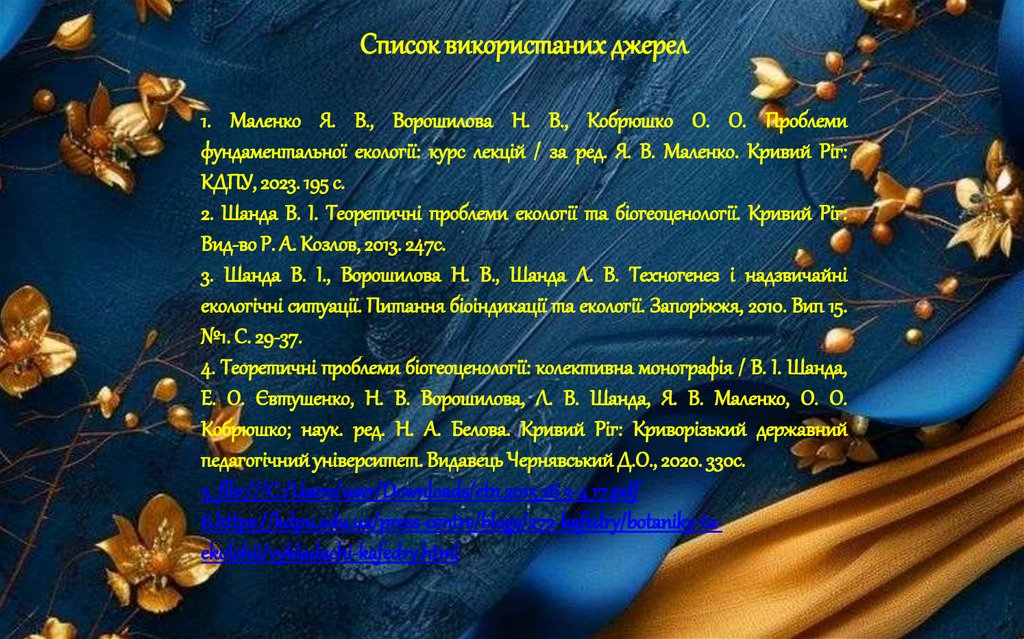 2. Шанда В. І. Теоретичні проблеми екології та біогеоценології. Кривий Ріг: