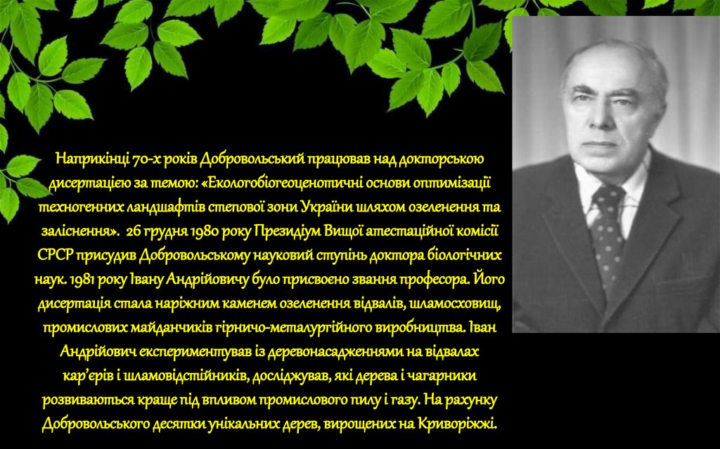 Наприкінці 70-х років Добровольський працював над докторськоюдисертацією за темою: «Екологобіогеоценотичні основи оптимізації