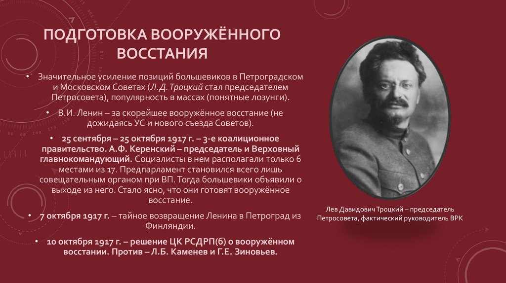 • 10 октября 1917 г. – решение ЦК РСДРП(б) о вооружённом
