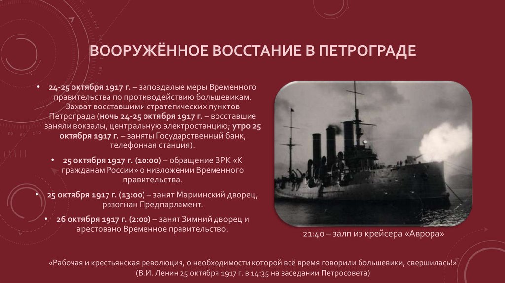 (В.И. Ленин 25 октября 1917 г. в 14:35 на заседании Петросовета)