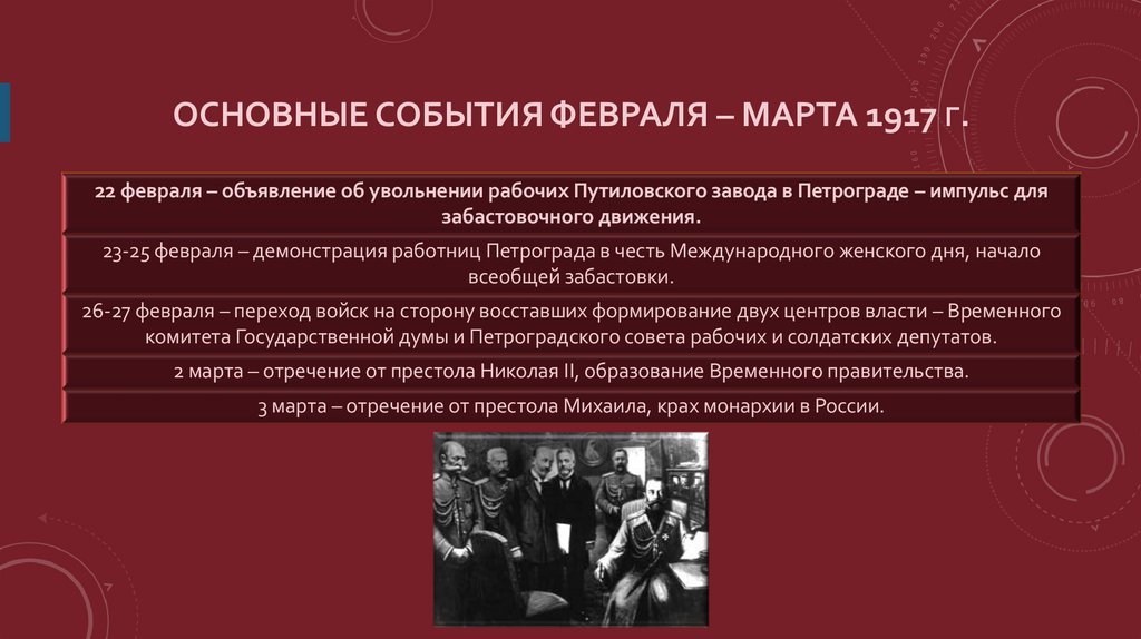 ОСНОВНЫЕ СОБЫТИЯ ФЕВРАЛЯ – МАРТА 1917 Г.22 февраля – объявление об увольнении рабочих Путиловского завода в Петрограде – импульс для