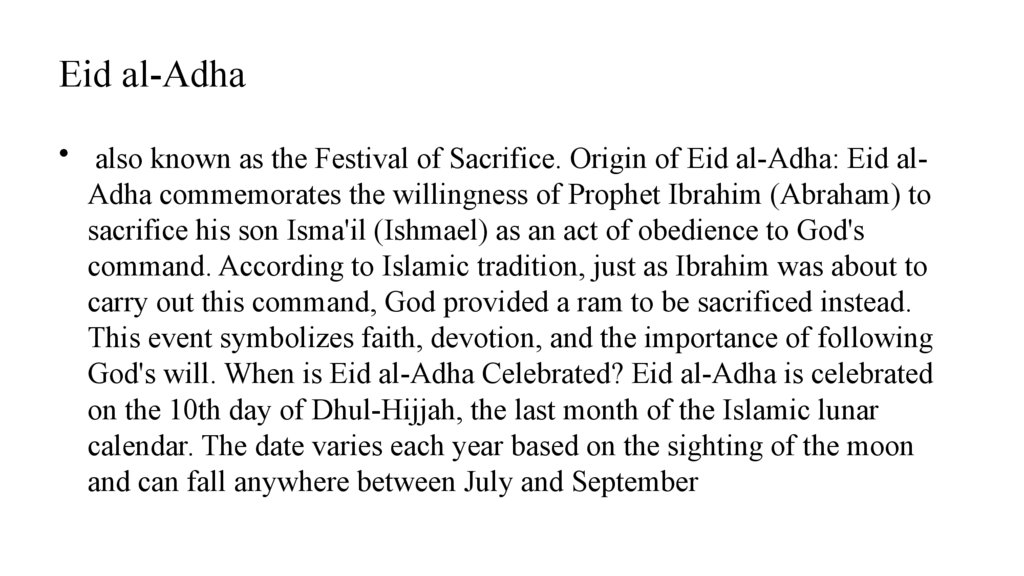 Eid al-Adha• also known as the Festival of Sacrifice. Origin of Eid al-Adha: Eid alAdha commemorates the willingness of Prophet Ibrahim (Abraham) to