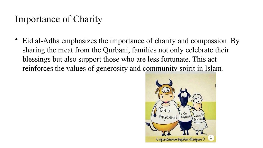 Importance of Charity• Eid al-Adha emphasizes the importance of charity and compassion. By