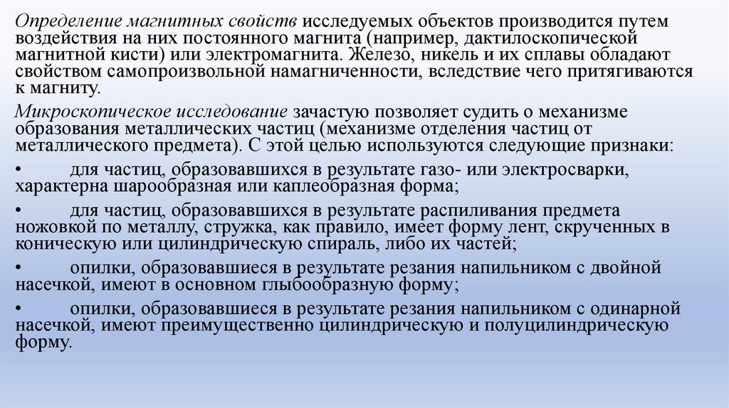Определение магнитных свойств исследуемых объектов производится путемвоздействия на них постоянного магнита (например, дактилоскопической