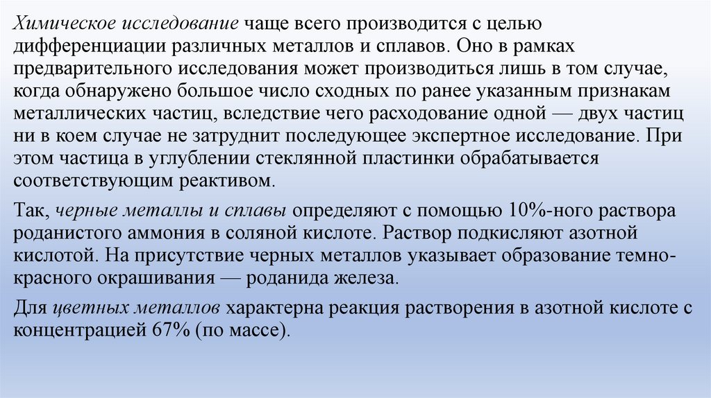 Химическое исследование чаще всего производится с цельюдифференциации различных металлов и сплавов. Оно в рамках