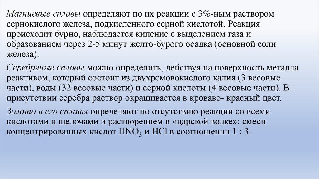 Магниевые сплавы определяют по их реакции с 3%-ным растворомсернокислого железа, подкисленного серной кислотой. Реакция