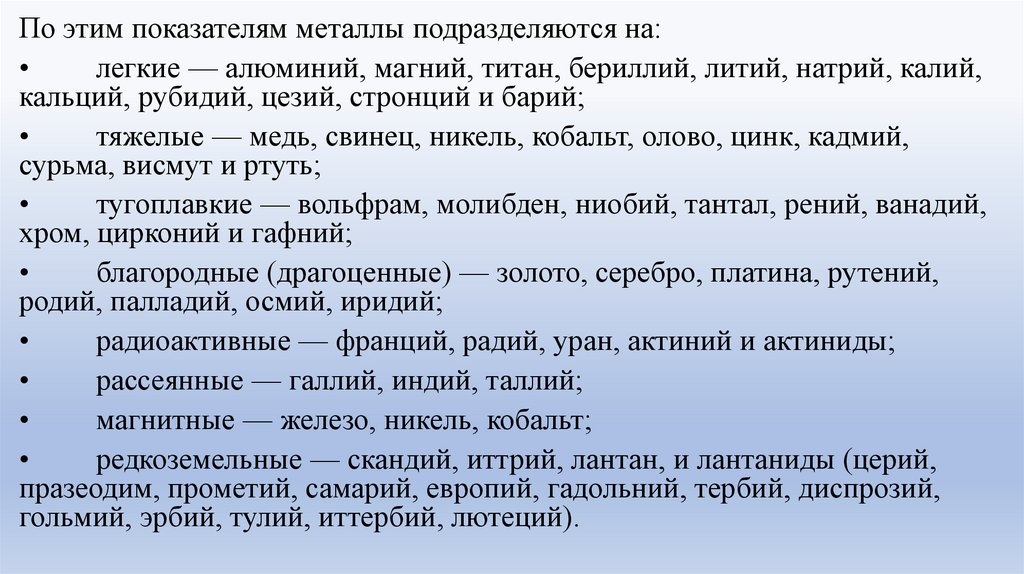 По этим показателям металлы подразделяются на:легкие — алюминий, магний, титан, бериллий, литий, натрий, калий,