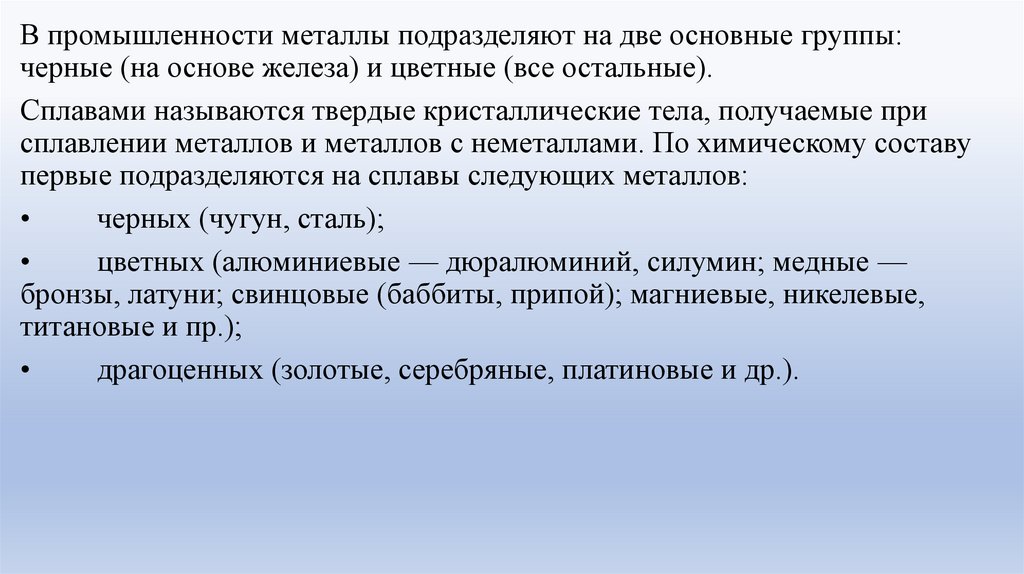 В промышленности металлы подразделяют на две основные группы:черные (на основе железа) и цветные (все остальные).