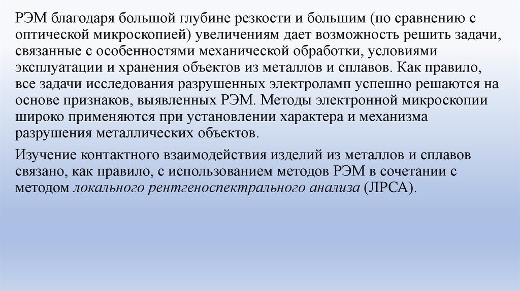 РЭМ благодаря большой глубине резкости и большим (по сравнению соптической микроскопией) увеличениям дает возможность решить задачи,