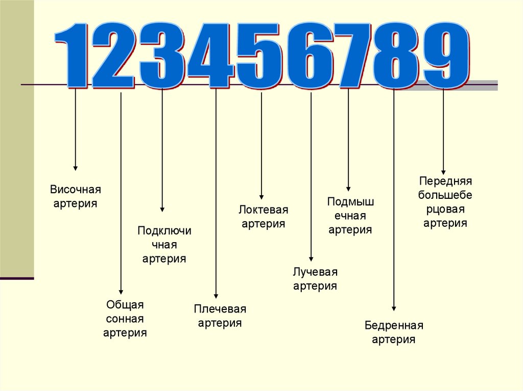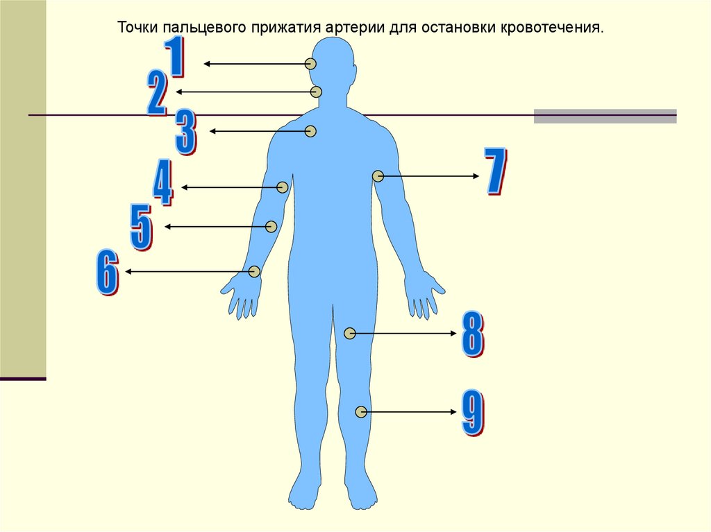 Точки пальцевого прижатия артерии для остановки кровотечения.11.
