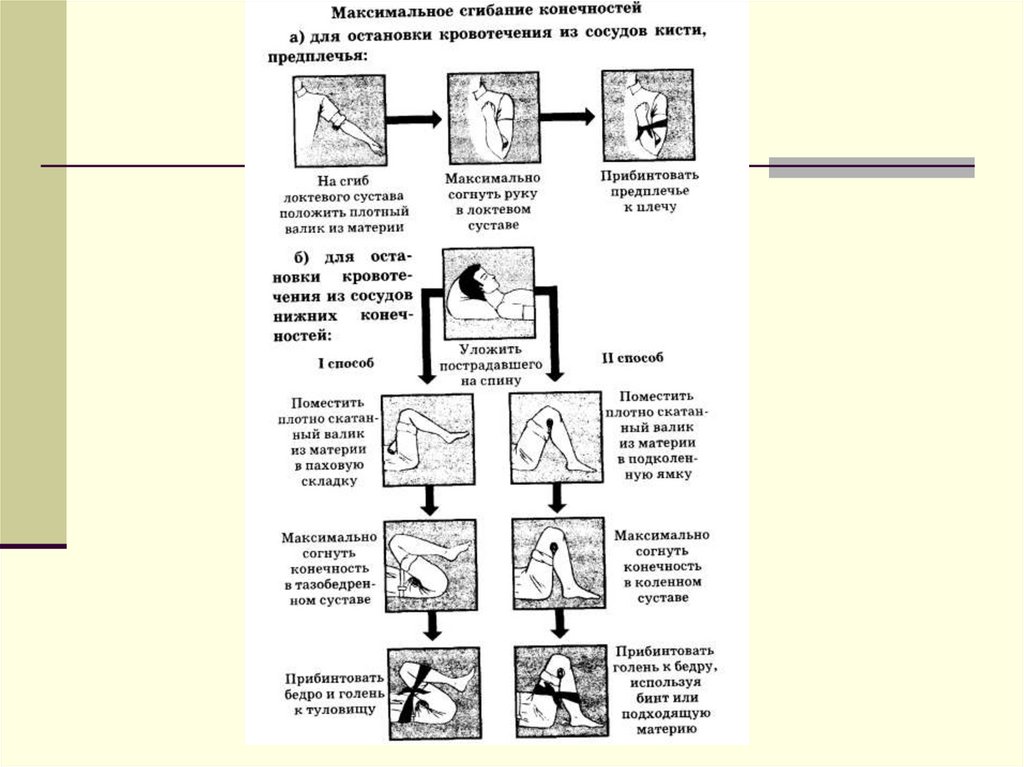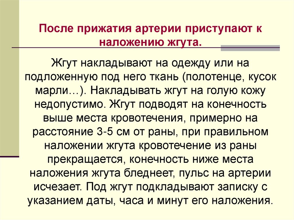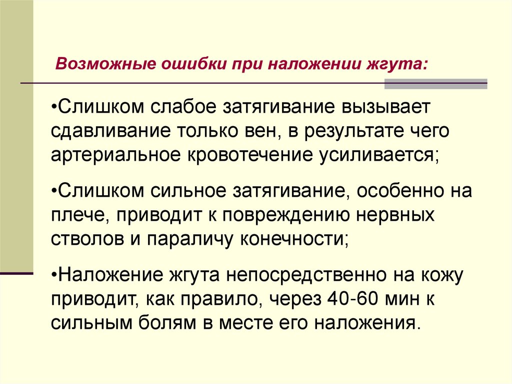 Возможные ошибки при наложении жгута:•Слишком слабое затягивание вызывает
