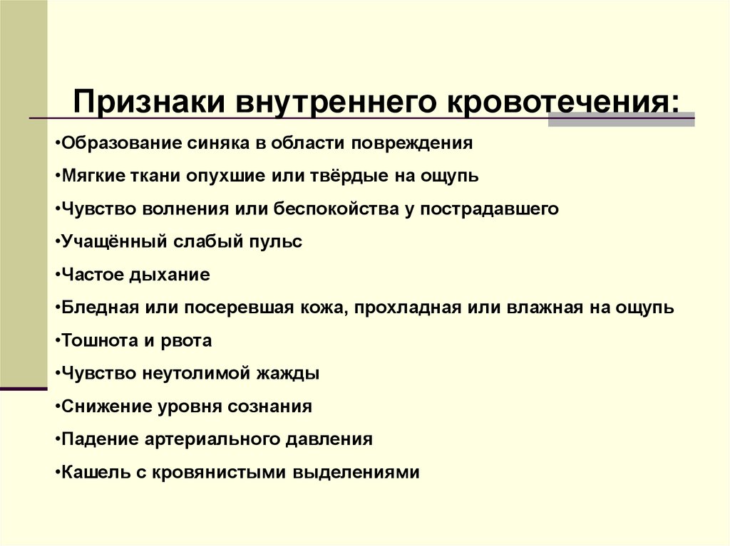 Признаки внутреннего кровотечения:•Образование синяка в области повреждения