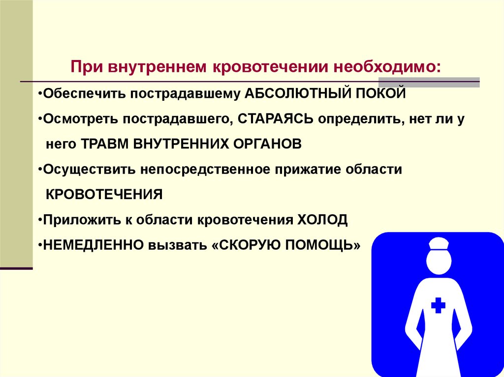 При внутреннем кровотечении необходимо:•Обеспечить пострадавшему АБСОЛЮТНЫЙ ПОКОЙ