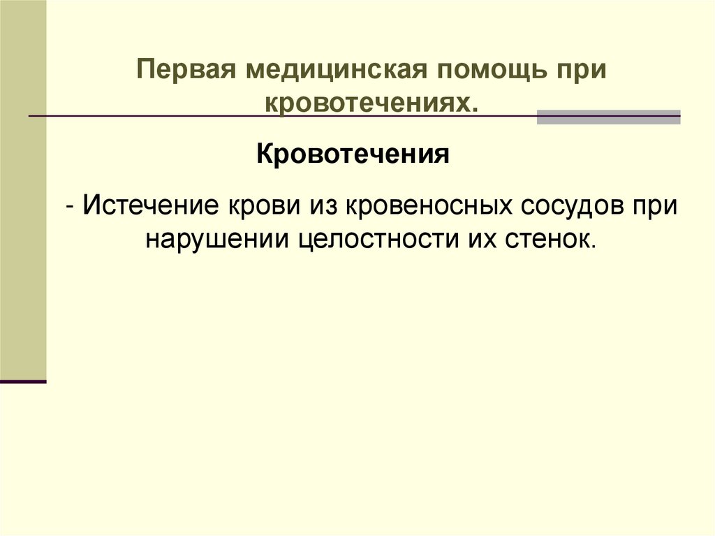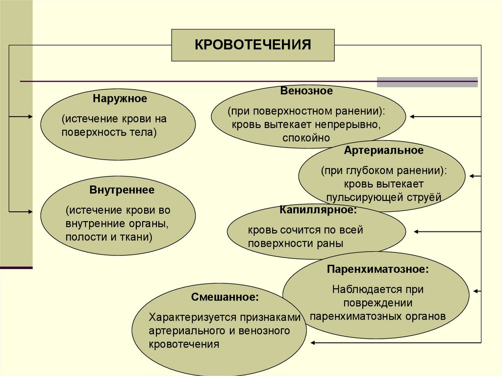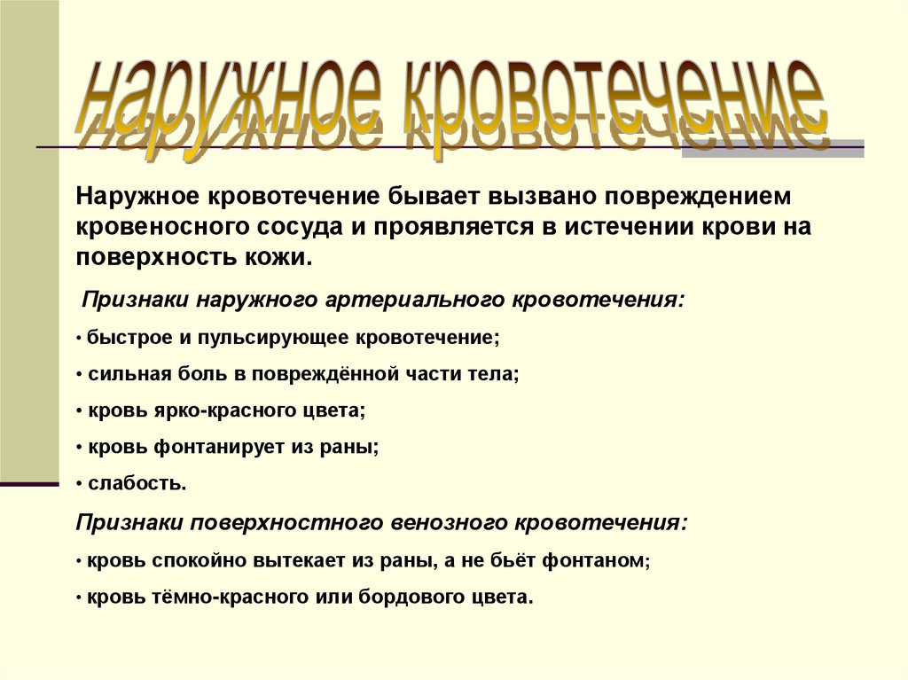 Наружное кровотечение бывает вызвано повреждениемкровеносного сосуда и проявляется в истечении крови на