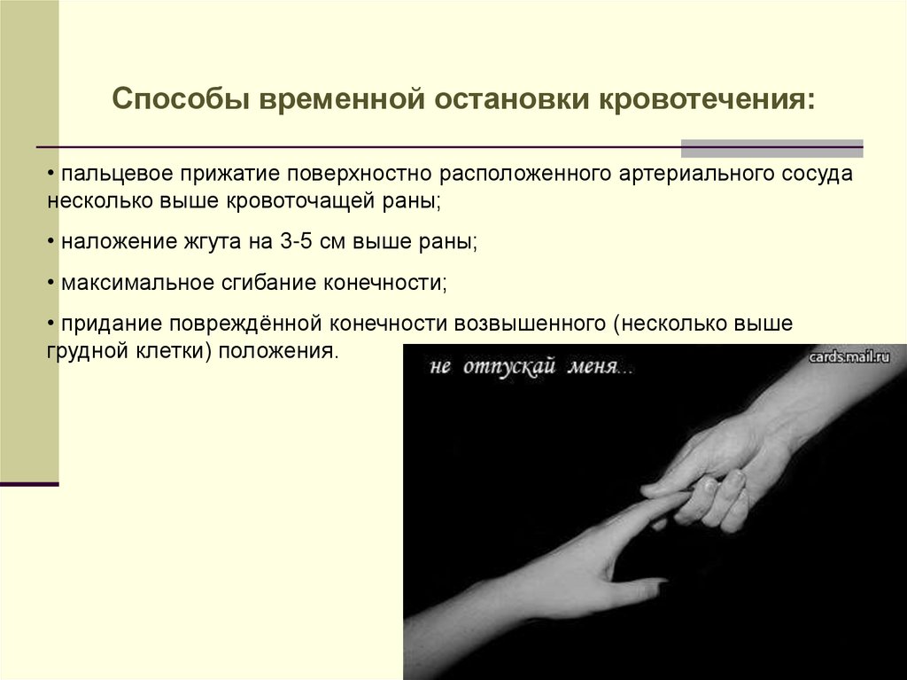 Способы временной остановки кровотечения:• пальцевое прижатие поверхностно расположенного артериального сосуда