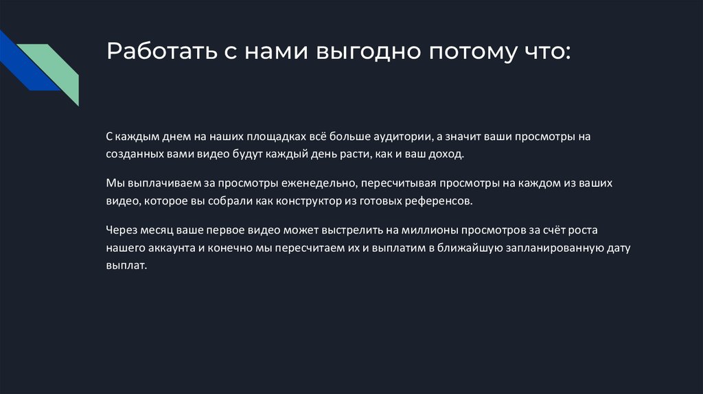 Мы выплачиваем за просмотры еженедельно, пересчитывая просмотры на каждом из ваших