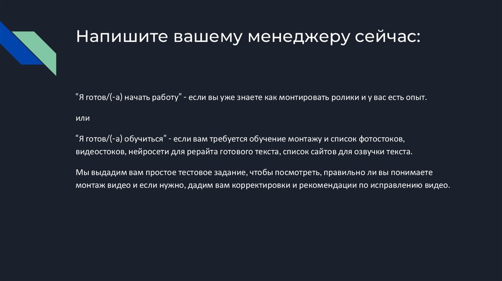 Напишите вашему менеджеру сейчас:“Я готов/(-а) начать работу” - если вы уже знаете как монтировать ролики и у вас есть опыт.