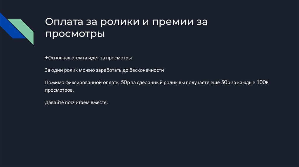 Помимо фиксированной оплаты 50р за сделанный ролик вы получаете ещё 50р за каждые 100К