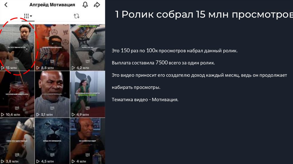 1 Ролик собрал 15 млн просмотровЭто 150 раз по 100к просмотров набрал данный ролик.