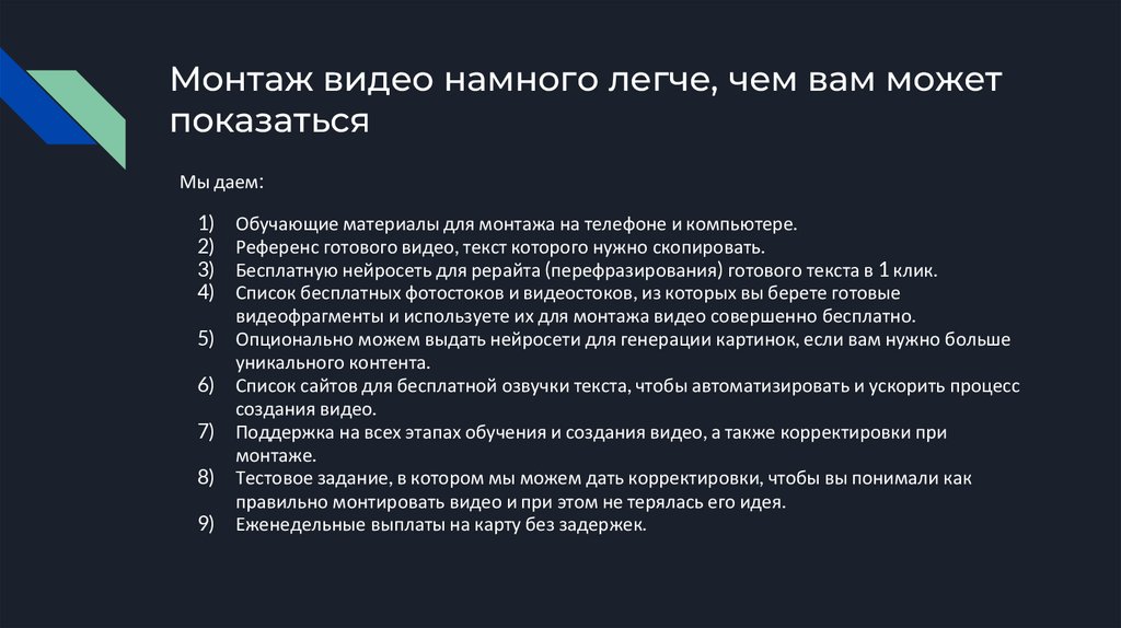 монтаж видео и если нужно, дадим вам корректировки и рекомендации по исправлению видео.
