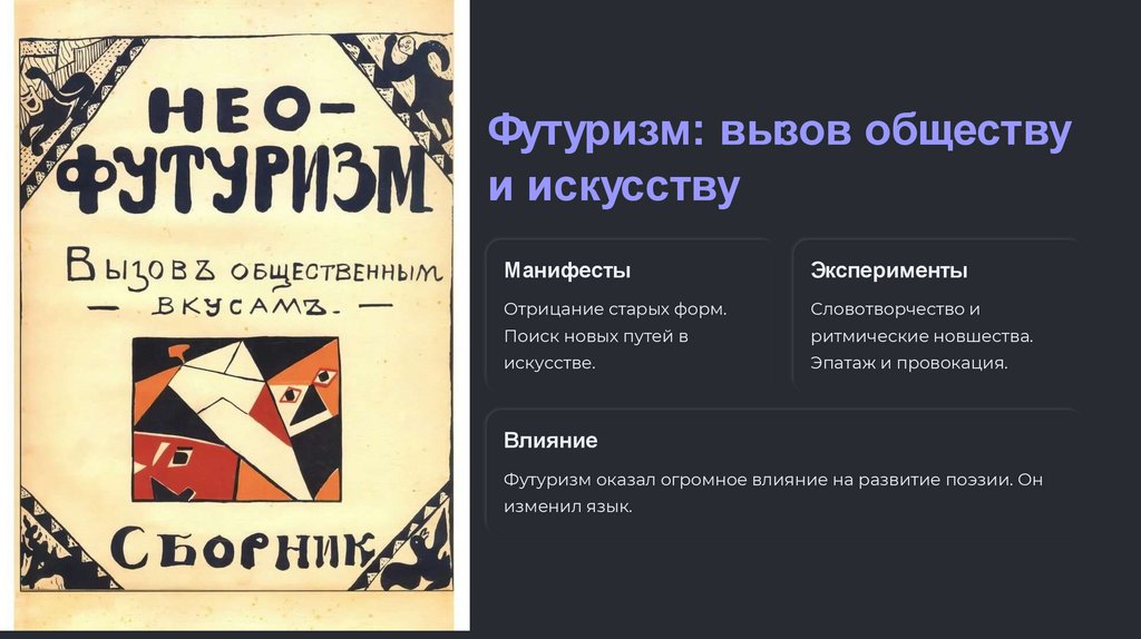 Футуризм оказал огромное влияние на развитие поэзии. Он